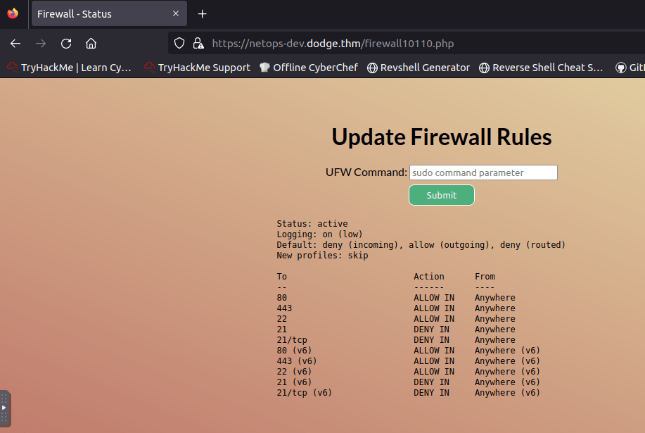 And that is how to Dodge a Firewall and get root access on the THM Dodge box! Hope the writeup was enjoyable.