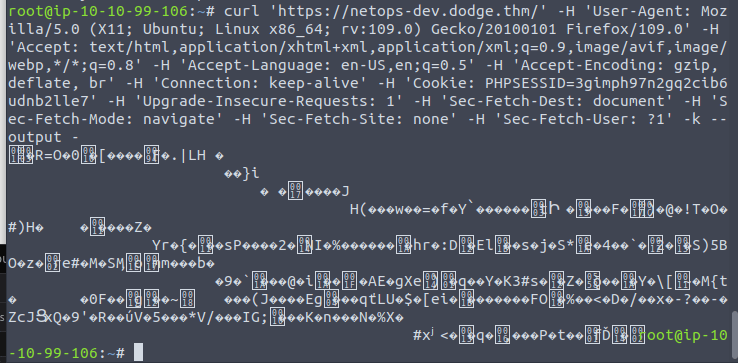 curl 'https://netops-dev.dodge.thm/' -H 'User-Agent: Mozilla/5.0 (X11; Ubuntu; Linux x86_64; rv:109.0) Gecko/20100101 Firefox/109.0' -H 'Accept: text/html,application/xhtml+xml,application/xml;q=0.9,image/avif,image/webp,*/*;q=0.8' -H 'Accept-Language: en-US,en;q=0.5' -H 'Accept-Encoding: gzip, deflate, br' -H 'Connection: keep-alive' -H 'Cookie: PHPSESSID=3gimph97n2gq2cib6udnb2lle7' -H 'Upgrade-Insecure-Requests: 1' -H 'Sec-Fetch-Dest: document' -H 'Sec-Fetch-Mode: navigate' -H 'Sec-Fetch-Site: none' -H 'Sec-Fetch-User: ?1' -k --output -