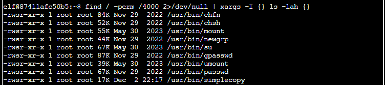 find / -perm /4000 2>/dev/null | xargs -I {} ls -lah {}