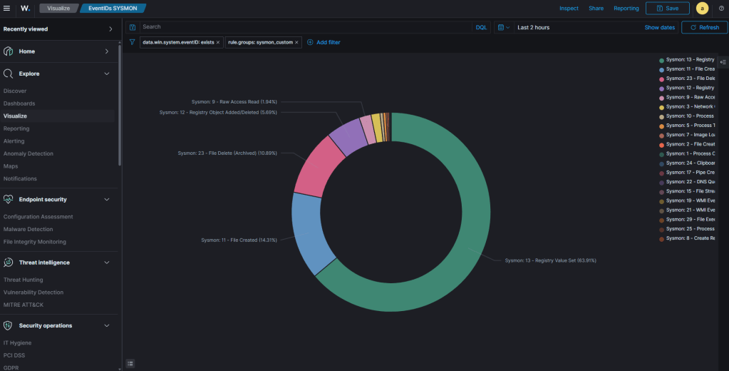 This post documents how I mapped specific Sysmon Event IDs to custom Wazuh rules, raised their visibility, and built a dashboard visualisation to track the noise.